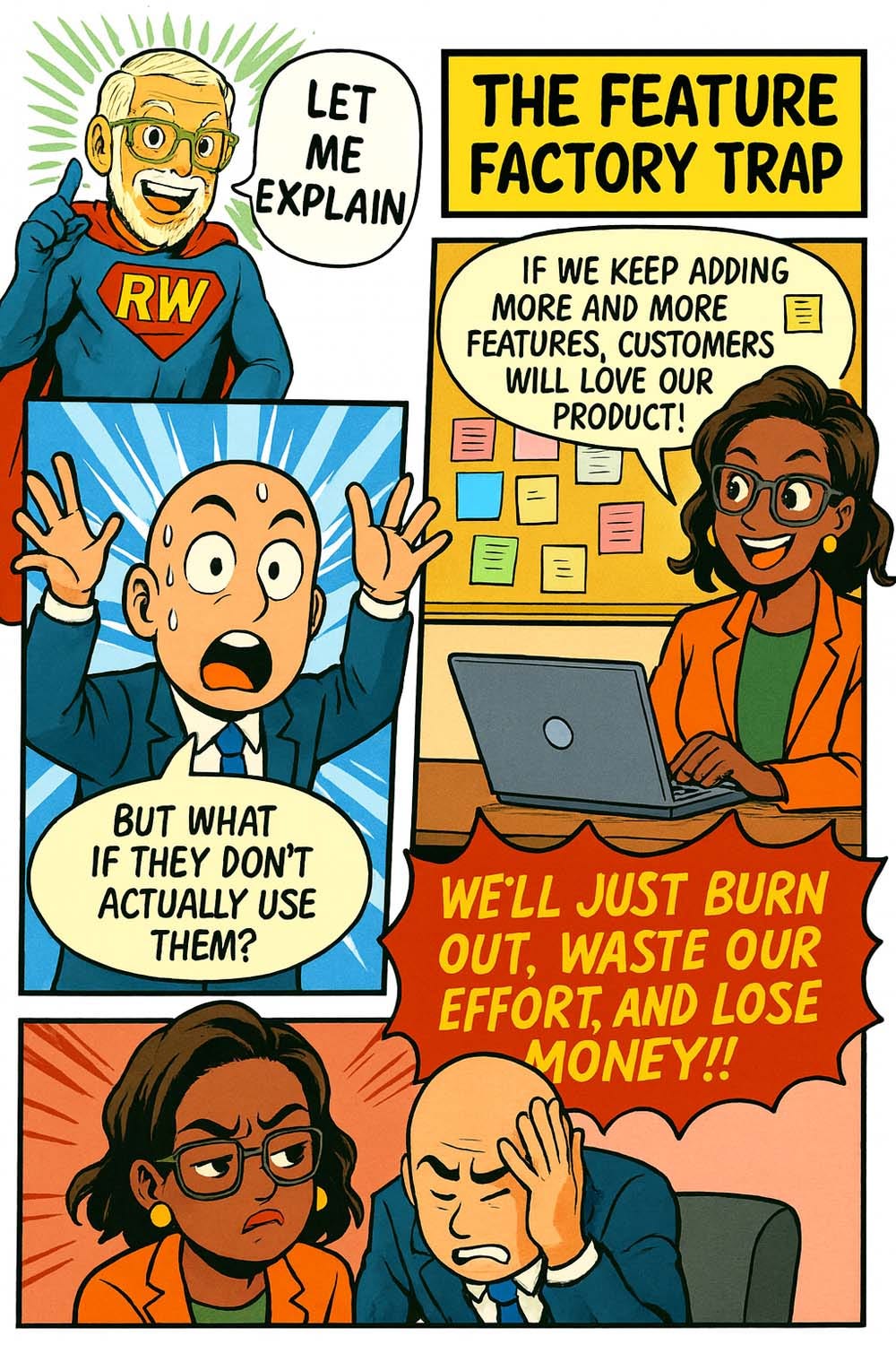 In many businesses, teams fall into the feature factory trap. This is when success is measured by how many new features are launched, not whether those features solve real customer problems or add business value.