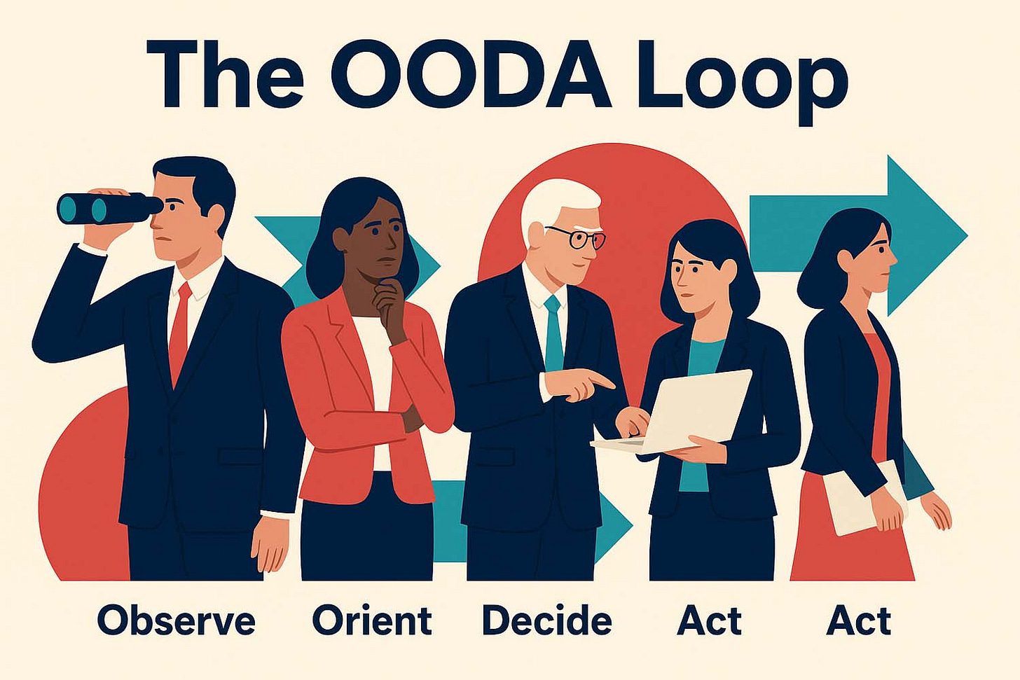 The OODA Loop is a decision-making model created by US Air Force Colonel John Boyd in the 1970s. It describes a repeating cycle of Observe, Orient, Decide, Act.