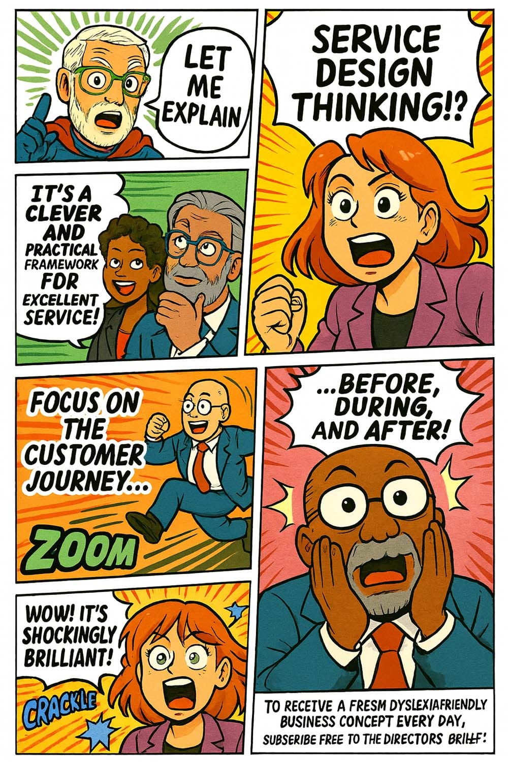 Service Design Thinking is a structured way to design or improve a service so it’s effective for the customer and efficient for the business. It focuses on how people experience the service from start to finish — not just what happens at each step.